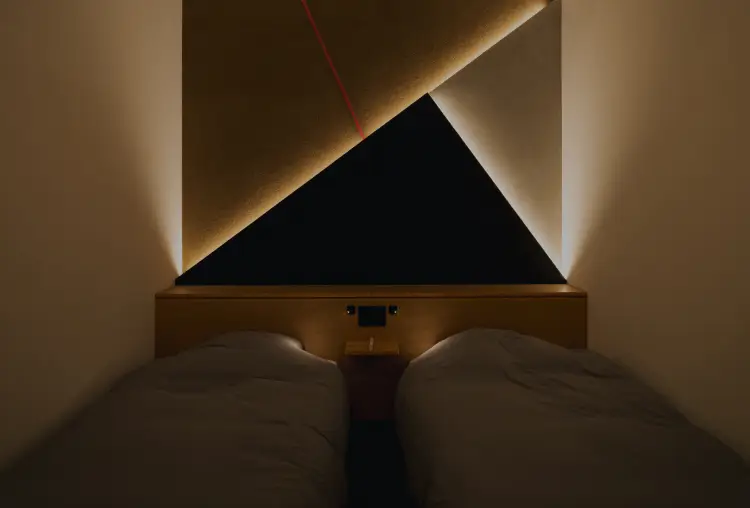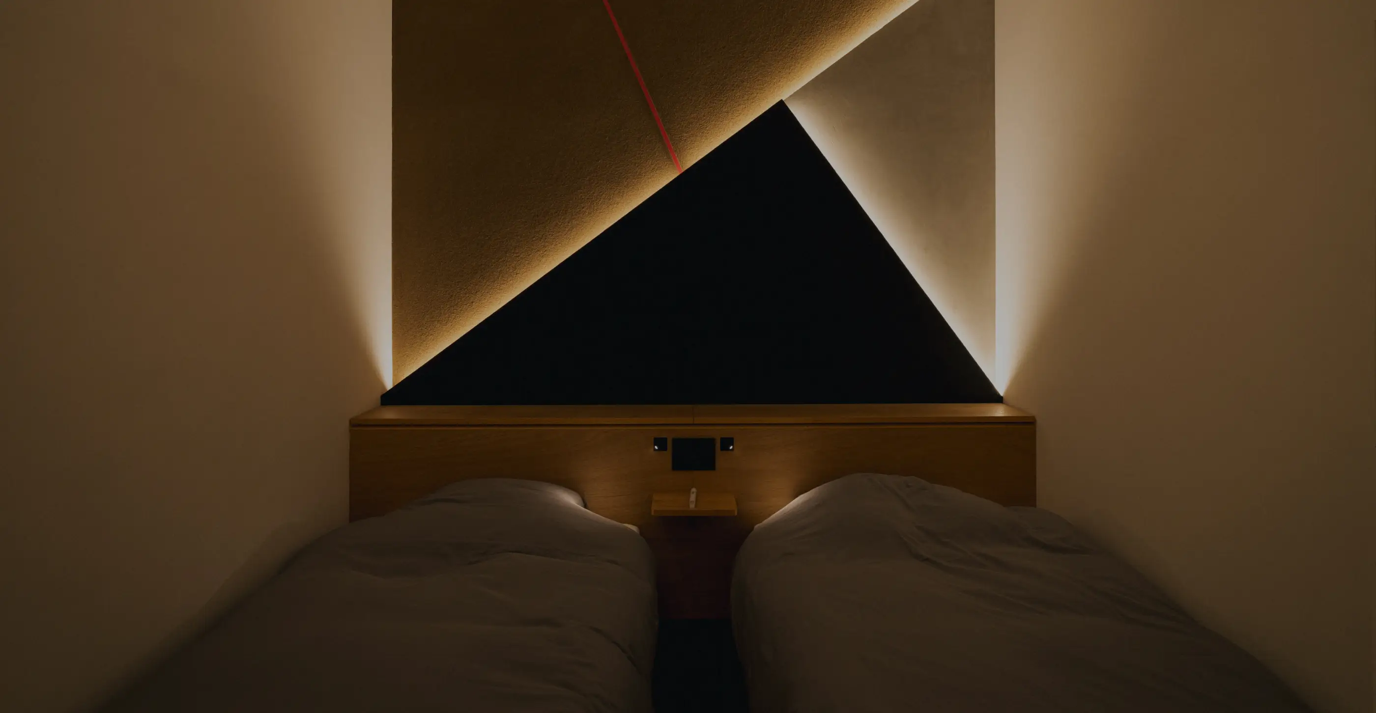 高めの天井で開放感のあるツインベッドルーム。土壁、モルタル、炭漆喰を塗り分けた化粧壁は、さまざまな自然の恩恵を受けた贅沢な空間を表現しています。2名用のお部屋ですので、ゆっくりと語り合いたい方とぜひ。