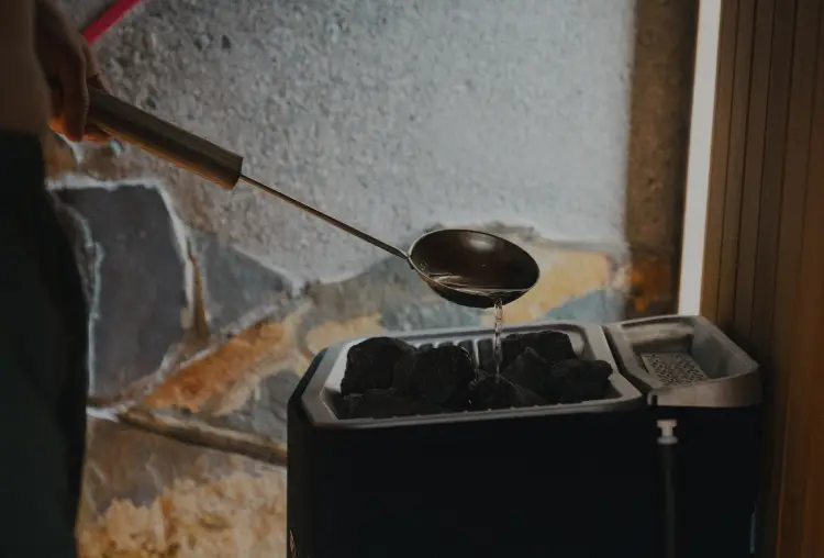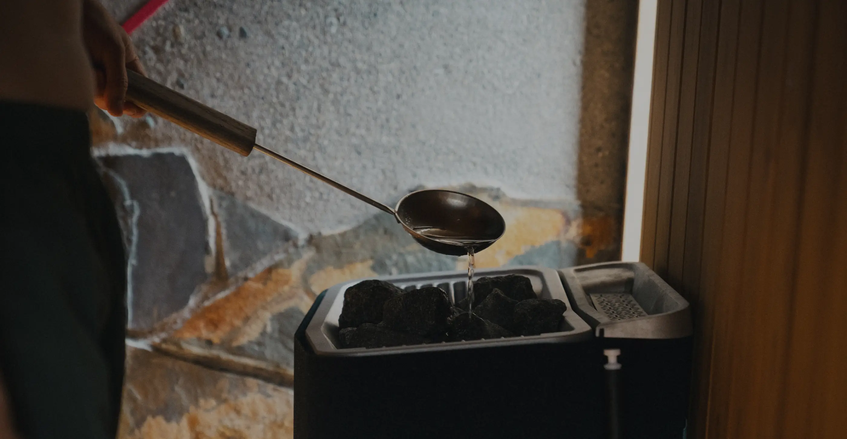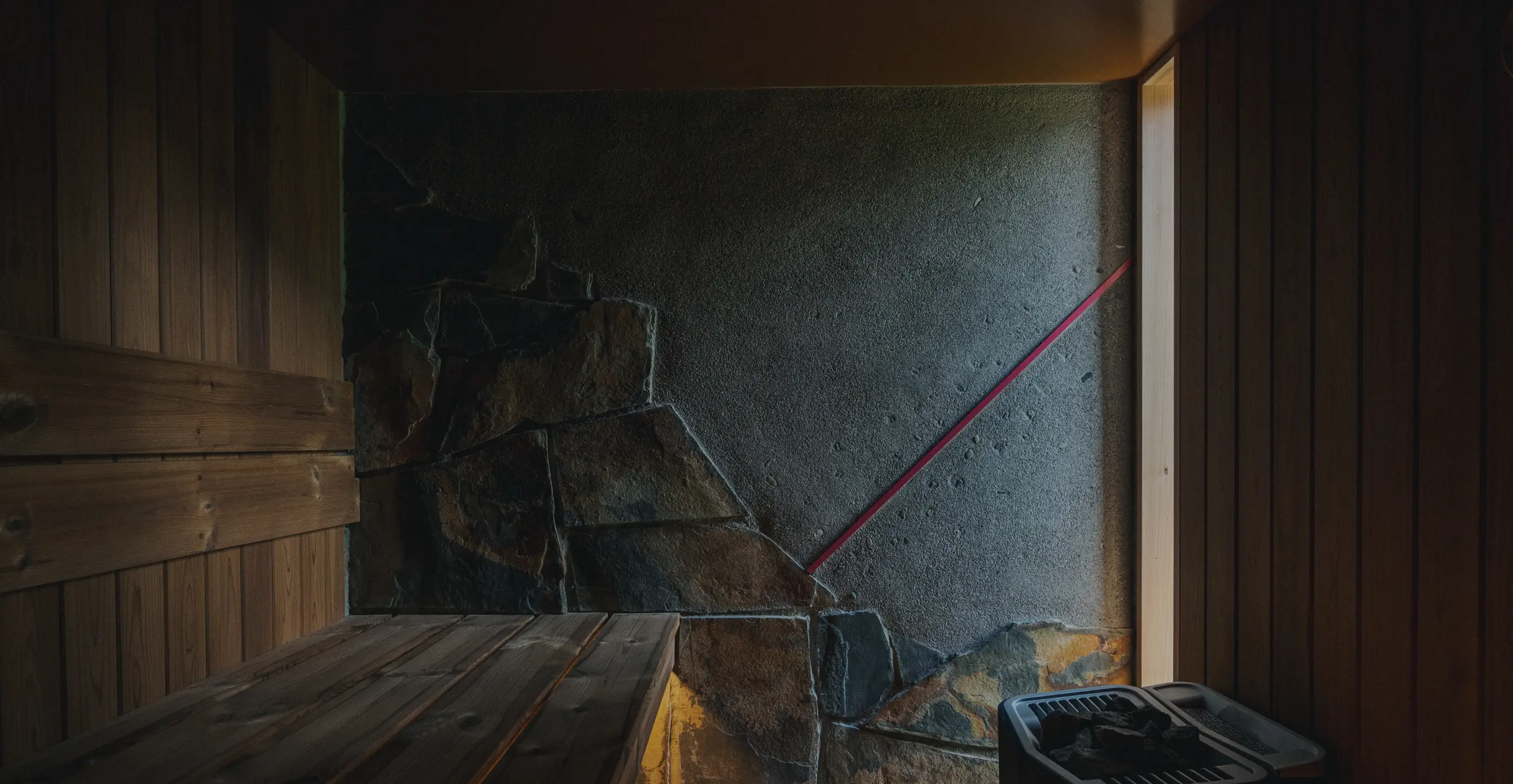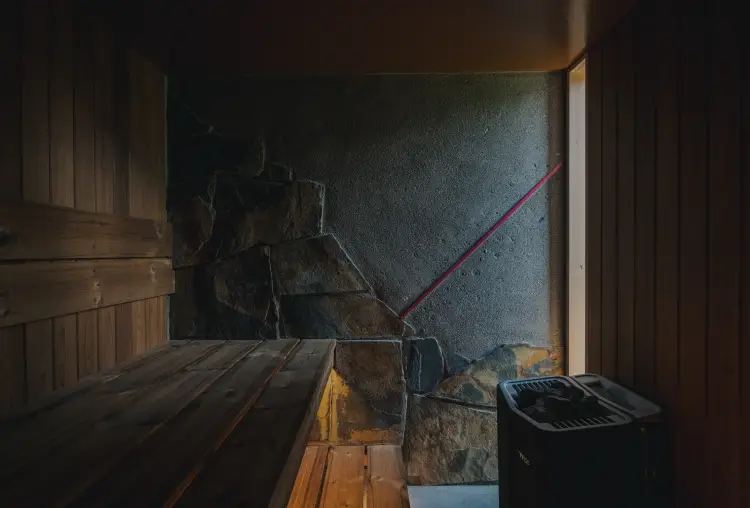 わずかながらの光が差し込むサウナはフィンランド式。スチームジェネレーター付きで高湿度を保っているため、70℃前後でもしっかり汗をかけます。サウナを出た後は水風呂と絶景ビューをお楽しみください。