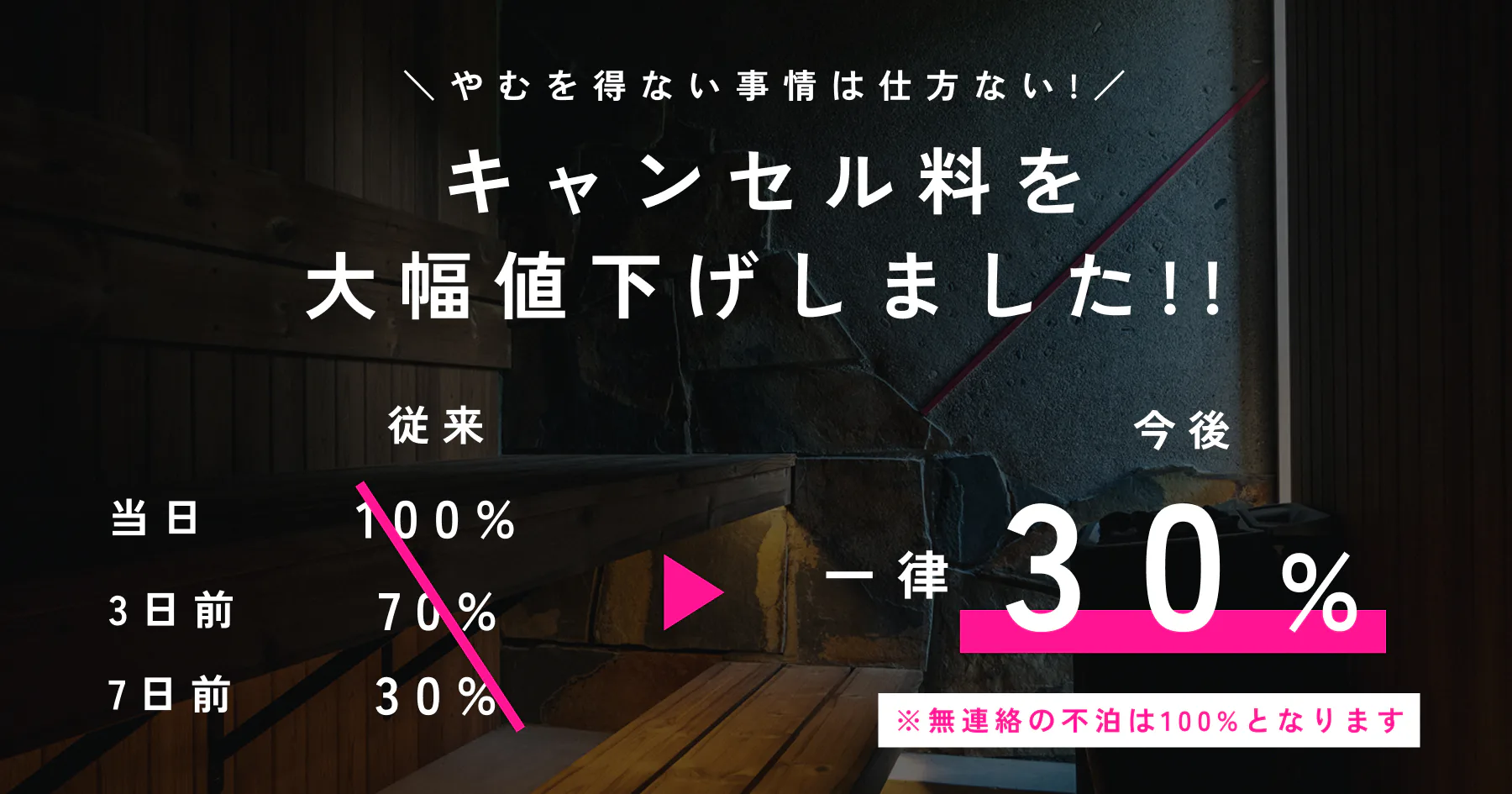 この度、サウナ付一棟貸し宿 DANDANでは、3日前・当日のキャンセルにつきましてキャンセルポリシーを改定し、大幅に値下げさせていただくことといたしました。